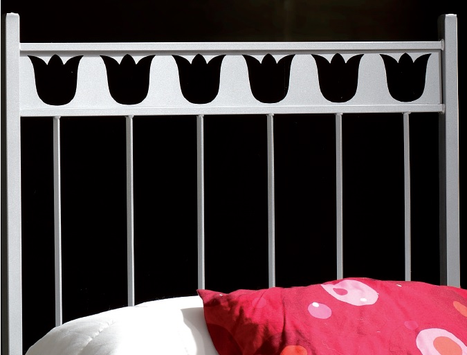 Cabecero con chapa central troquelada en forma de tulipanes y patas de acero cuadrada de 118cm de altura.