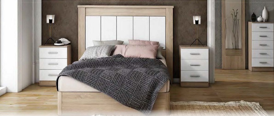 Composición (1 cabecero+2 mesitas 3 cajones+1 Ssnfonier+tabla mural), Cabecero, 2 mesitas 3 cajones, Sinfonier, Espejo, Canapé 135×190