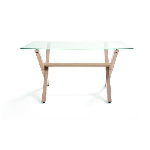 El diseño de la mesa Rosende es perfectamente minimalista por su sencilla estructura compuesta de barras de acero en color madera perfectamente equilibradas, cuatro de las cuales se entrecruzan para formar las patas en diagonal, unidas transversalmente por otro listón que las estabiliza junto a su tapa de cristal templado de la mejor calidad.