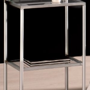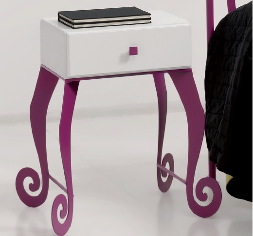 Mesita de noche con pata de acero en corte por láser y cajón de madera.